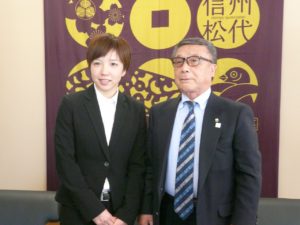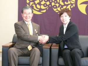 先日ワールドカップ最終戦を終えたばかりの小平奈緒選手(長野市スケート協会・相沢病院)が、加藤久雄会長(長野市長)へ今季の報告にみえました。