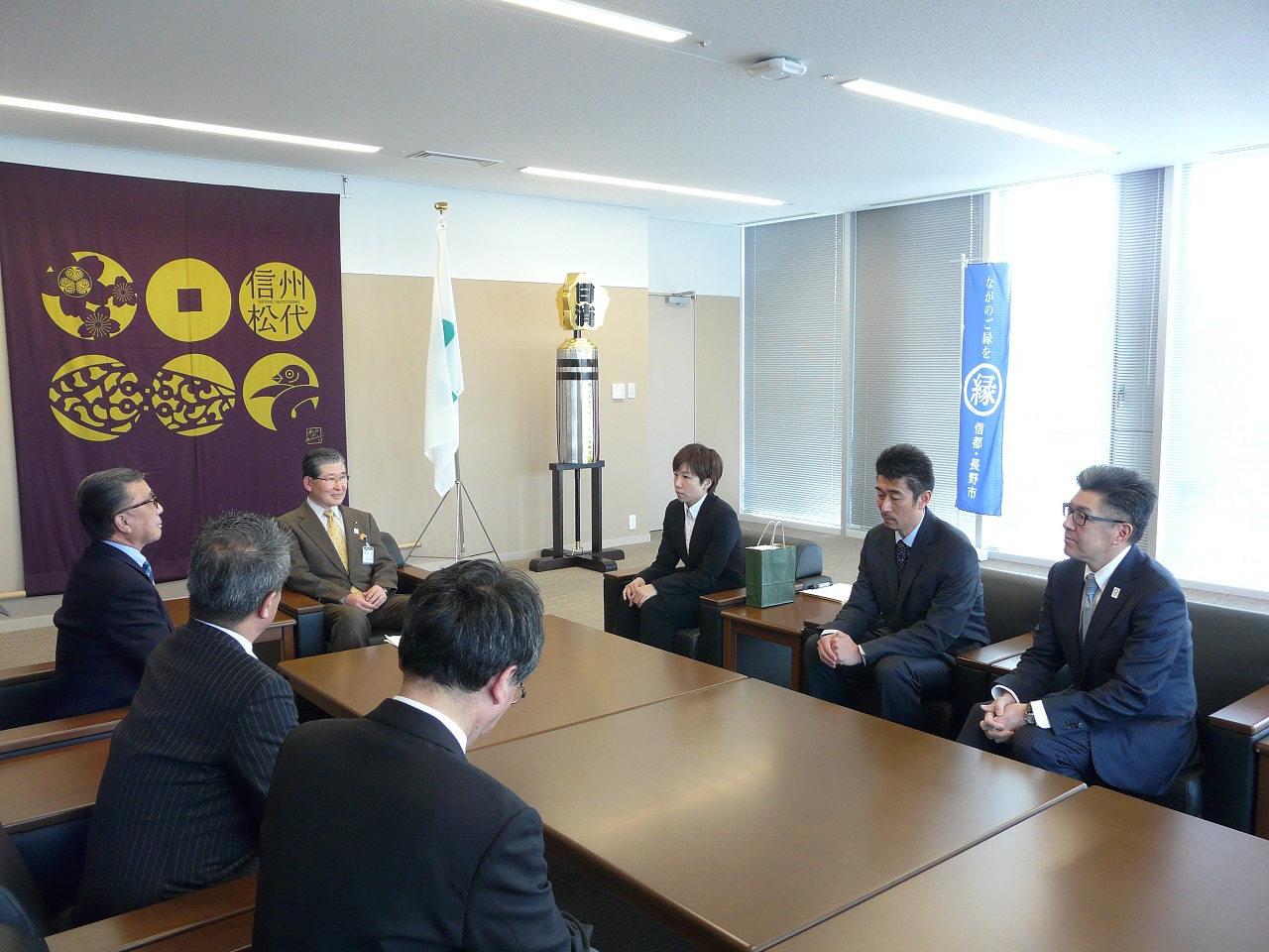 先日ワールドカップ最終戦を終えたばかりの小平奈緒選手(長野市スケート協会・相沢病院)が、加藤久雄会長(長野市長)へ今季の報告にみえました。