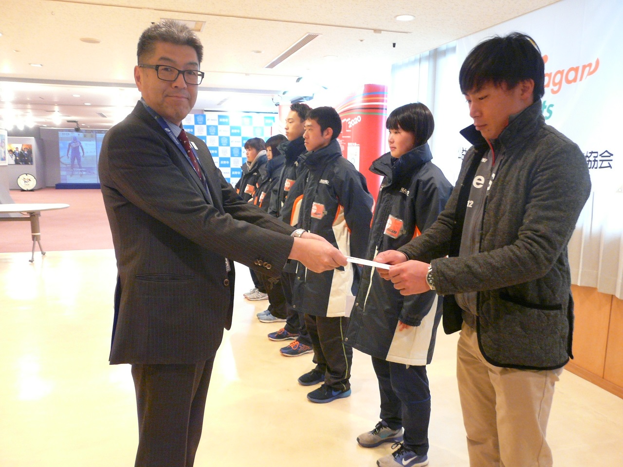 1月27日(金)、長野市オリンピック記念アリーナ(エムウェーブ)において、国民体育大会冬季大会に出場する長野市在住、監督・選手の激励金授与式を開催しました。
