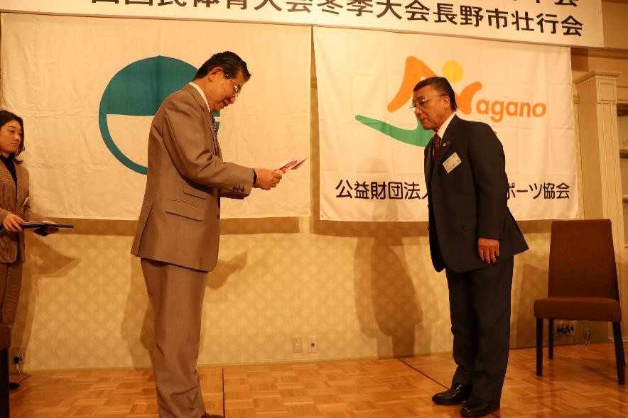 当日は、出場選手未発表のため、各競技団体代表者の皆様にご出席いただき、加藤会長(長野市長)から激励のことばと激励金の目録授与が行われました。