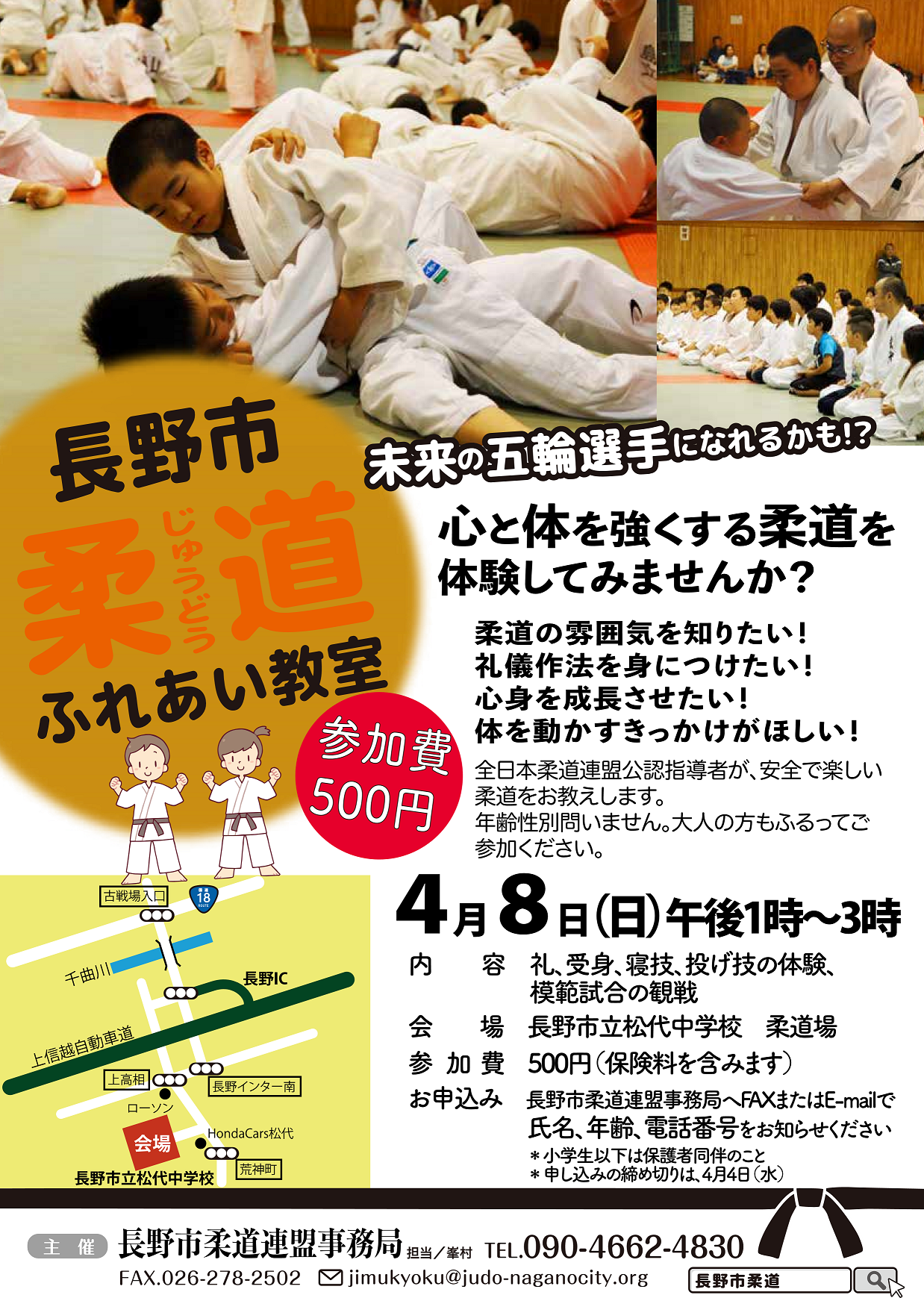 参加希望者の氏名、年齢、電話番号を、電話、ファクスまたはEメールで、市柔道協会事務局峯村さん(☎090-4662-4830、FAX278-2502、✉jimukyoku@judo-naganocity.org)へ